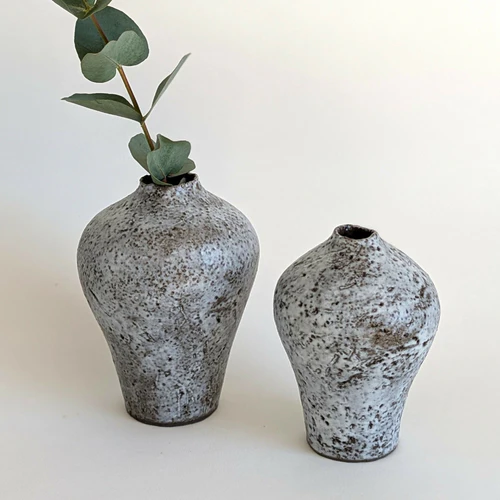 Vases en grès, émail blanc mat. Emaillé à l’intérieur, peut contenir de l’eau.